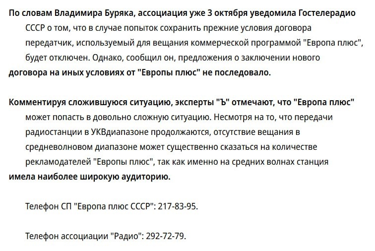 Случайно найденная в старом паблике статейка от 31.12.1990. К теме современных технологий вещания. "ЕВРОПА ПЛЮС" ЛИШИЛАСЬ ВОЗМОЖНОСТИ ВЕЩАТЬ НА СРЕДНИХ ВОЛНАХ. С 1 января передачи радиостанции "Европа плюс" идут только в диапазоне УКВ. Выход радиостанции в эфир на средних волнах прекращен в силу того, что контракт между ней и ассоциацией "Радио", предоставлявшей "Европе плюс" средневолновый передатчик, не был продлен на 1991 год. С 4 января в 18.00 на частоте 1116 кГц стали выходить программы Музыкального центра Стаса Намина. Таким образом радиостанция "Европа плюс" лишилась большей части своих слушателей и, по всей вероятности, лишится части своих доходов от рекламы. Передачи радиостанции "Европа плюс" являются продукцией СП "Европа плюс СССР". СП специализируется на музыкально-информационном радиовещании, производстве радиопрограмм, создании центров подготовка персонала для радиовещания. Раньше станция называлась "Европа плюс Москва", но, начав передачи в УКВ-диапазоне еще в не