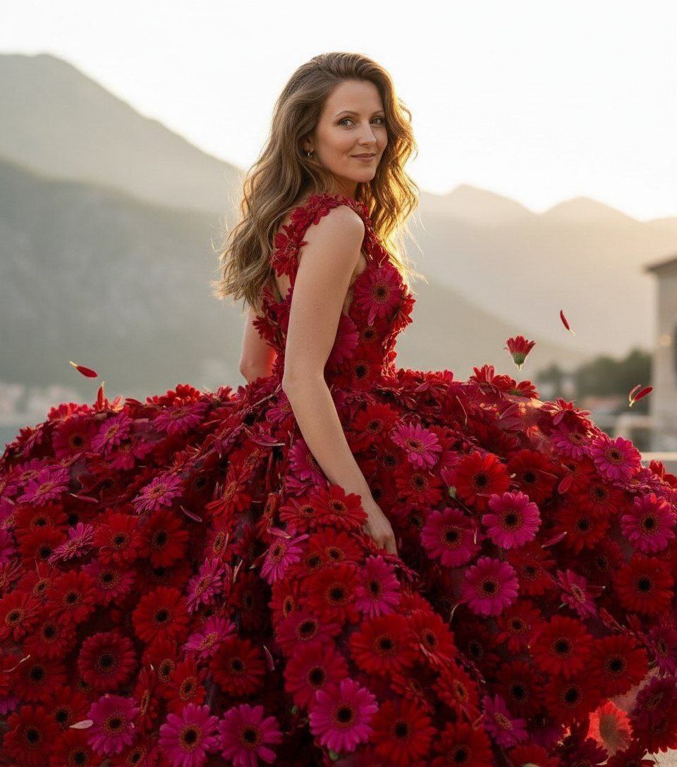 От подписчицы @Izkandera, которая поздравляет девушек с праздником.❤️ Цветы прописывайте в промпте какие хотите. Не меняя внешности женщины с фото, перед нами предстаёт образ изысканной грации на фоне мягко освещённых горных вершин в золотой час. Женщина стоит в полуобороте, её взгляд направлен в сторону камеры, выражая лёгкую улыбку и спокойствие. В её волосах, распущенных волнами, играет солнечный свет, создавая тёплое сияние. Платье, полностью покрытое живыми цветами в оттенках насыщенного алого и ярко-розового, кажется продолжением природы вокруг, словно она расцвела вместе с этим пейзажем. Ткань платья скрыта под густым слоем крупных цветов с бархатистыми лепестками, которые придают наряду объем и текстурную сложность, создавая ощущение объёмного природного ковра с лепестками, лёгкими и воздушными, будто слегка колышущимися на ветру, некоторые из них находятся в движении, словно отпускаемые ветром. Свет падает сзади, слегка подсвечивая контуры платья, добавляя глубину и подчёркив