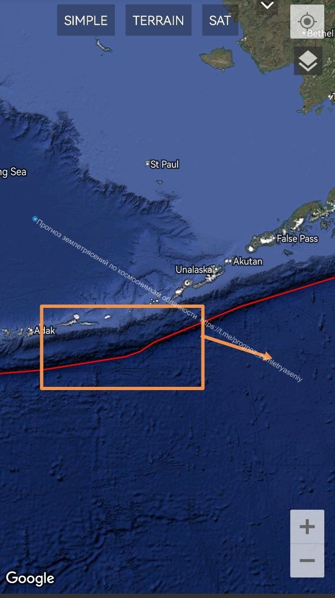 По Аляске в районе Уналашки перспектива землетрясения М6+ сохраняется в течение 9 дней