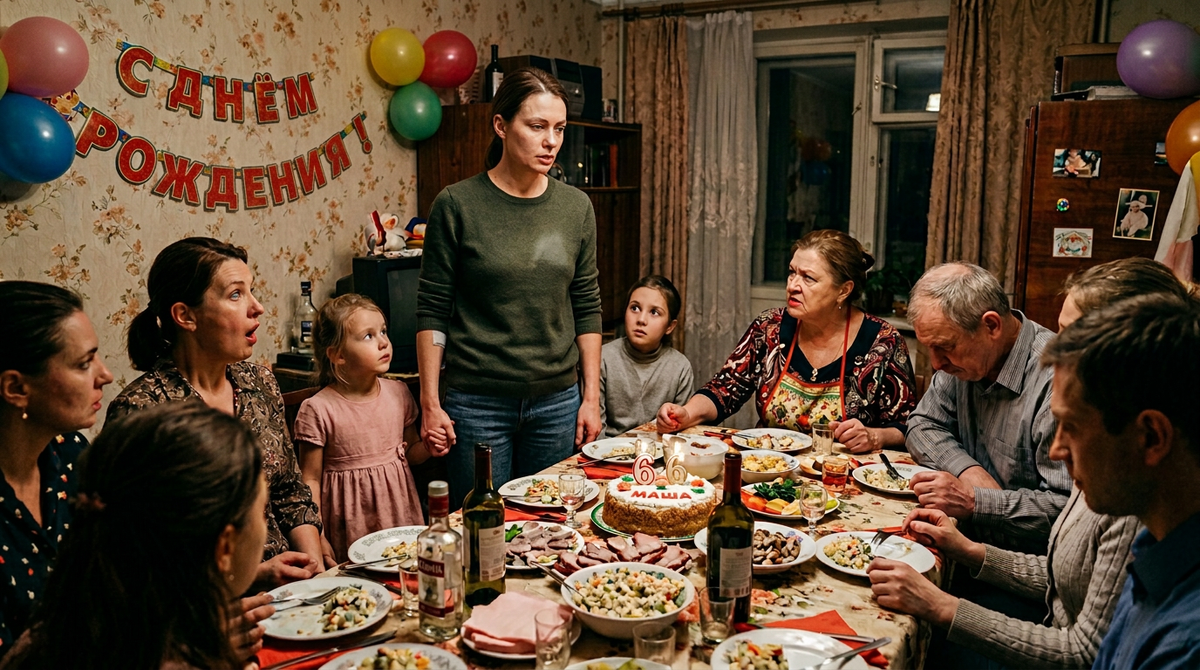 Стол накрыт. Гости уже сидели. Тётя Нина — мамина сестра. Дядя Володя — её муж. Ещё соседи — Валентина Ивановна, Пётр Семёнович.