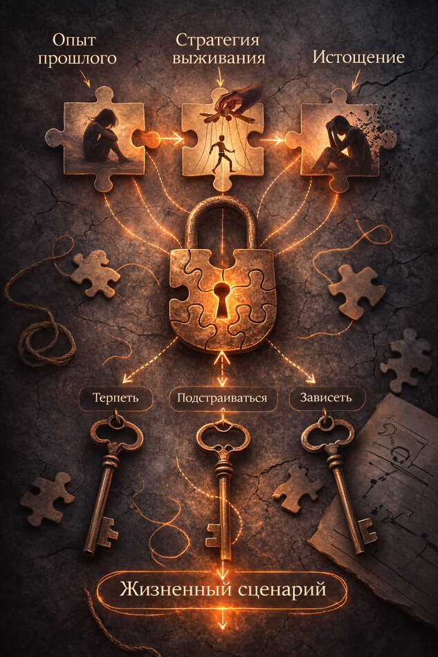 Ваш жизненный сценарий: от выживания к истощению В прошлом посте Как депрессивная стратегия жизни отражается в теле я писала о том, как телесные симптомы могут отражать внутренние конфликты и депрессивные способы адаптации. 👣Сегодня важно сделать шаг глубже. Депрессия редко возникает «вдруг». Чаще она вырастает из ❗устойчивого способа жить. У каждого человека есть своя стратегия выживания. Психология называет это по-разному: жизненный сценарий, травма- компенсаторная схема, травматическая адаптация, депрессивный паттерн. Суть одна. Когда-то эта стратегия помогла нам справиться, выжить, сохранить отношения., не быть отвергнутыми. Но с ней вынуждено пришлось потерять свою внутреннюю опору. Например: ▪ Быть удобной и не создавать конфликтов. ▪ Держаться за отношения любой ценой. ▪ Никогда не злиться открыто. ▪ Брать на себя слишком много ответственности. ▪ Терпеть, когда страшно потерять безопасность. В детстве или в ранней взрослости это действительно работало. Это помогало оставаться в