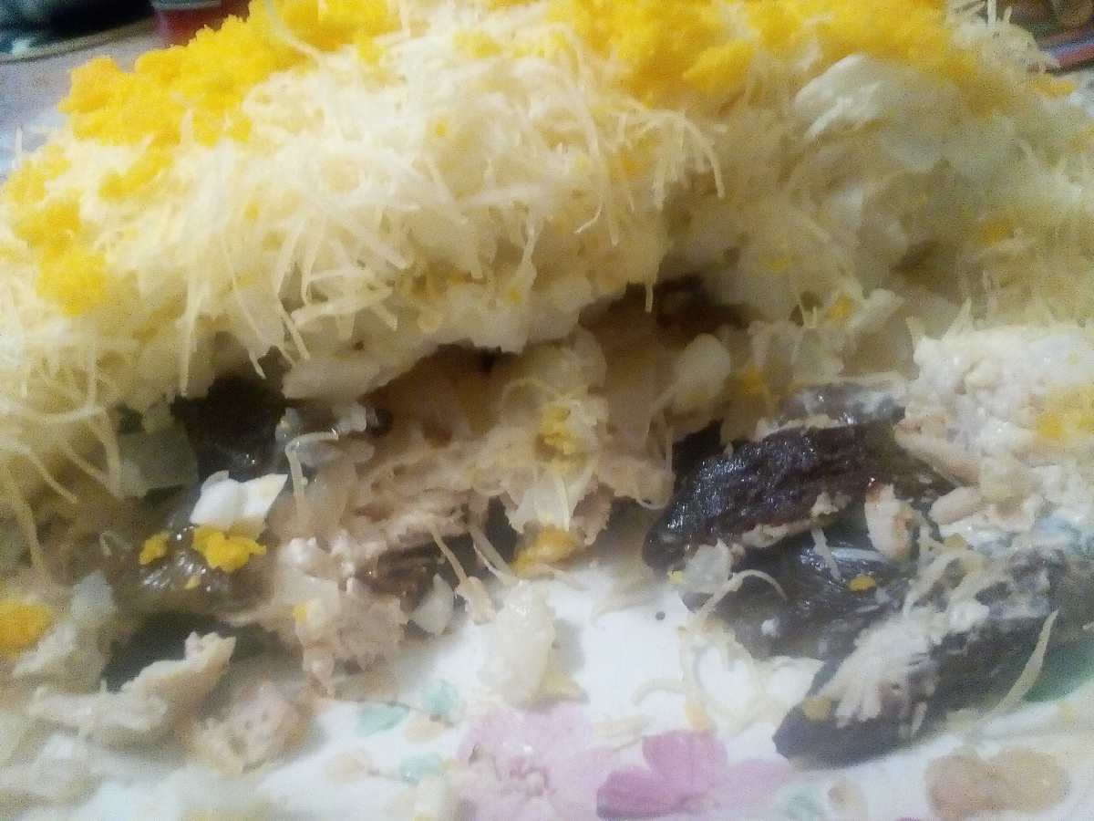 Рассказываю. 1. Отваное куриное филе кусочками - смешиаем с кусочками чернослива (инжира, фиников). Кому что нравится. Майонезим. 2. Слой отверной картошки. Или мелкие кубики, или на крупной тёрке. Кому что... Майонез не забываем. 3. Слой грибов, обжаненых с луком. Тут можно забыть про майонез , на масле же... 4. Слой яиц. Вареных. А именно белка. Мелко порезанного. Майонезим. Желток пойдёт на украшение салата поверх тёртого сыра. 5. Слой опять же - картошки с майонезом. 6. Тёртый на мелклй тёрке сыр и покрошенный желток. Я бы рекомендовал посыпать вначале укропчиком или другм чем зеленым. Чтоб напиминало мимозу. 7. Некоторые любят добавит слой из яблока или морковки.. Или смешивают тётртое яблоко и отварную морковь. Как в селёдке под шубой, ага. Мне понравилось. :0)