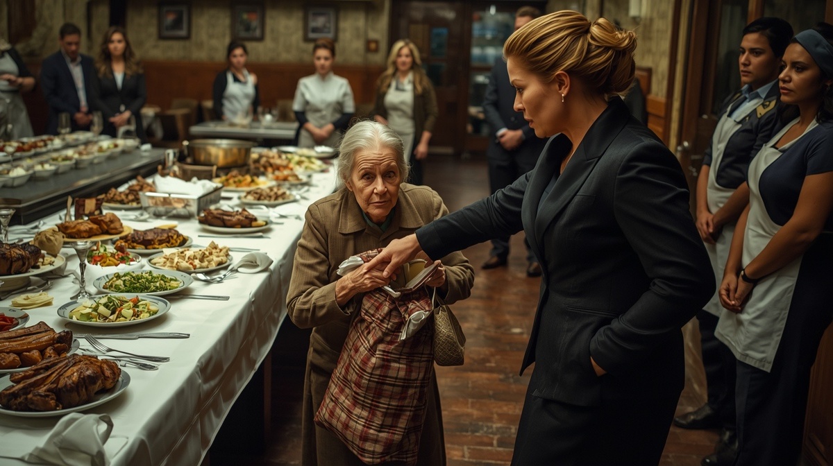 В ту ночь я вышла на кухню за чистыми пакетами и краем глаза увидела её у служебного входа. Баба Нюра стояла спиной ко мне и что-то укладывала в свою старую клетчатую сумку — такие раньше называли «мечта оккупанта». Я пригляделась: в сумку она складывала еду с банкетного стола — завёрнутые в салфетки куски буженины, несколько тарталеток, половину нетронутого пирога с капустой. Брала аккуратно, без спешки, как человек, который точно знает, зачем это делает.