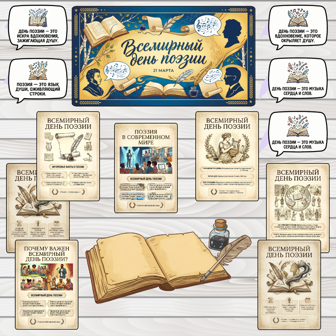 В наборе: Данный набор материалов предназначен для создания в школе многофункционального тематического пространства, посвящённого поэзии. Его цель - не просто проинформировать о дате, но и вовлечь учащихся в диалог с поэтическим словом, сделав поэзию видимой, осязаемой и актуальной частью школьной среды. Основные педагогические задачи, которые помогает решить оформление: 1. Преодоление стереотипа о поэзии как о чём-то сугубо академическом, скучном или оторванном от жизни. Через современный визуальный язык и нестандартные форматы (речевые облачка, плакат-книга) поэзия предстаёт как живая, динамичная форма самовыражения.