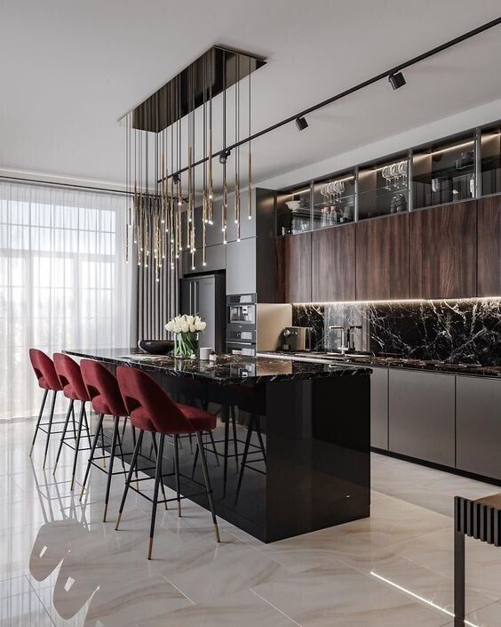 Эстетика: Здесь нет нагромождения мелкой техники, разделочных досок и кастрюль. Только чистота линий, выверенная симметрия и дорогие фактуры.