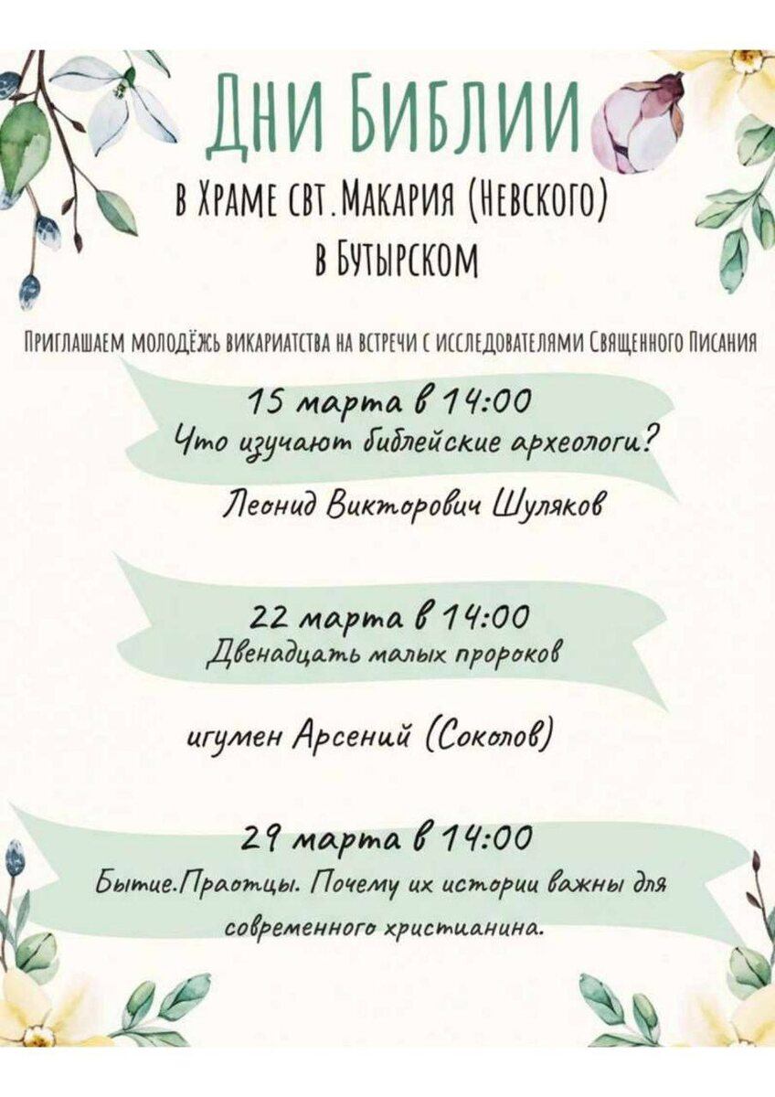 В Северо-Восточном викариатстве пройдет образовательный лекторий «Дни Библии» для молодежи. На встречах священники, молодежь, ответственные за молодежную работу и все интересующиеся Библией будут беседовать и обсуждать интересные темы. 15 марта в 14:00 состоится встреча «Что изучают библейские археологи?» с Л.В. Шуляковым, преподавателем Института классического Востока и античности (Высшая школа экономики), старшим преподавателем Сретенской духовной академии. 22 марта в 14:00 запланирована встреча «Двенадцать малых пророков» с игуменом Арсением (Соколовым), доктором богословия, профессором Николо-Угрешской духовной семинарии. 29 марта в 14:00 пройдет встреча «Бытие. Праотцы. Почему их истории важны для современного христианина?» с В.С. Стреловым, ректором Библейского колледжа «Наследие», преподавателем Николо-Угрешской духовной семинарии. Мероприятия будут проходить в храме святителя Макария (Невского), митрополита Московского и Коломенского, в Бутырском (https://sprav.moseparh.ru/org/