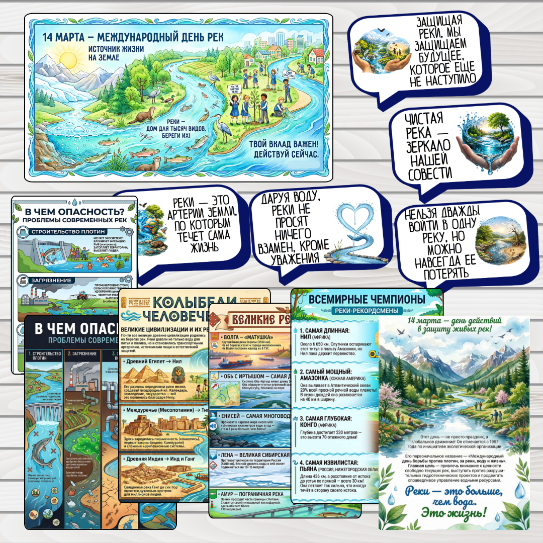 В наборе: Такое оформление - это не просто украшение стенда, а многофункциональный образовательный и воспитательный инструмент. Вот ключевые цели и практическая польза: 2. Визуальное привлечение внимания и вовлечение в тему. Крупный, яркий плакат (3 листа А4) сразу выделяется в школьном пространстве (рекреация, холл, библиотека) и «цепляет» взгляд даже у тех, кто просто проходит мимо. 3. Стимулирование диалога и критического мышления. 4. Создание информационного повода для внеурочной деятельности. Оформление становится «точкой входа» и наглядной поддержкой для целой серии мероприятий. #МеждународныйДеньРек #экология #образование #информационныеЛисты