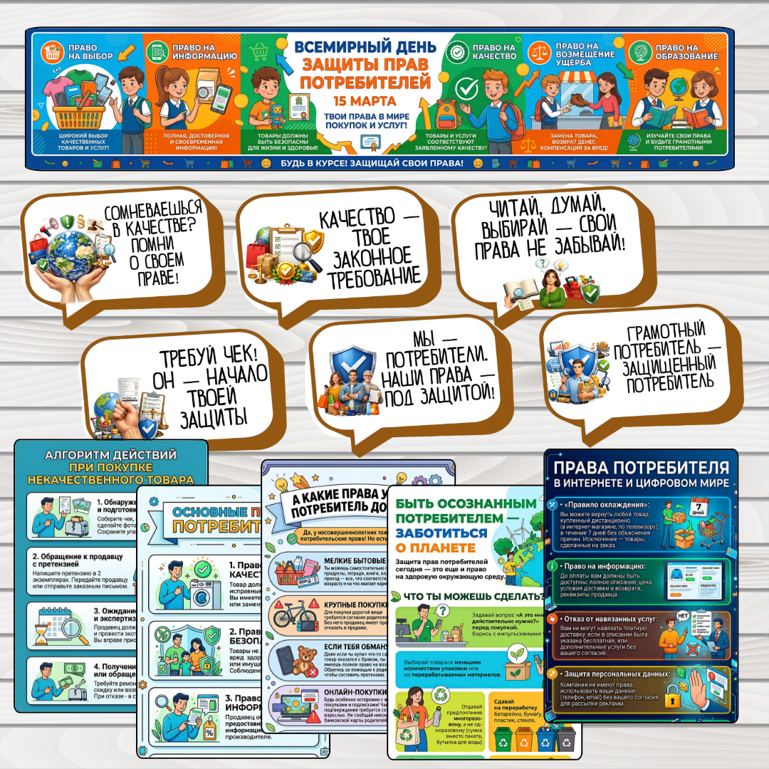 В наборе: Цель: Повышение правовой и потребительской грамотности школьников, формирование у них навыков осознанного, безопасного и ответственного поведения на рынке товаров и услуг. Актуальность: Современные дети и подростки - активные потребители. Они самостоятельно покупают еду, одежду, гаджеты, пользуются онлайн-сервисами, мобильными приложениями и цифровым контентом. Однако они часто не знают своих прав и не умеют их защищать, что делает их уязвимыми для недобросовестной рекламы, мошенничества и приобретения некачественных товаров. Такое многоуровневое оформление превращает обычный информационный стенд в интерактивное образовательное пространство. Оно работает на разных уровнях восприятия: привлекает, вовлекает, информирует и воспитывает. Это не просто «галочка» в плане мероприятий, а реальный вклад в формирование грамотного, уверенного и ответственного потребителя и гражданина.