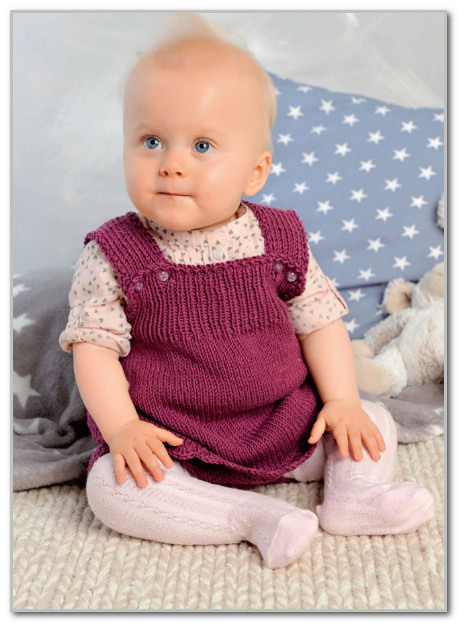 Это платьице на бретелях в комплекте с короткими штанишками под подгузник сослужит добрую службу в любое время года. Модель вяжется быстро — простой лицевой гладью, а по нижнему краю украшена каймой, связанной крючком узором "ракушки".