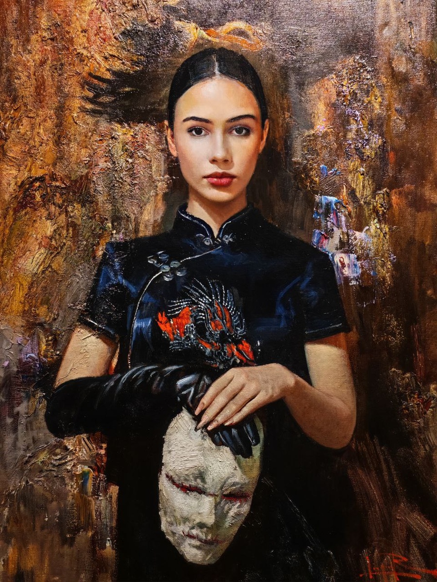 Что вы видите здесь? Она надела перчатку на правую руку и держит в ней маску. Так и хочется сделать отсылку к произведению Ахматовой. Левая рука прикрывает правую - символ внутреннего конфликта. При этом рука в перчатке держит маску, глаза и губы которой, если присмотреться, словно зашиты и кровоточат. В противоположность маске девушка, держится отстраненно, словно безразличный наблюдатель, лишённый каких-либо эмоций. На ней надето ципао - символ традиций. Правая рука - социальная роль, она контролирует маску. Перчатка - её броня. На сцене все видят сильный и властный образ, но никто никогда не заглядывал за кулисы. Левая рука - истинное Я, которое контролирует правую. Она без перчатки, поэтому беззащитна и уязвима. И как бы не было парадоксально, но её единственный способ защититься - защитить авторитет правой руки. Конечно, поста не хватит рассказать о всей глубине шедевра. Но я под впечатлением)
