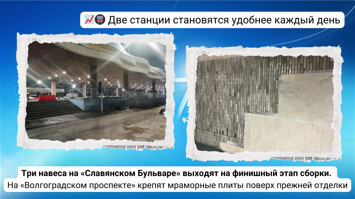 "Беговая" D1/D4, и обсудим станцию "Кедровая" Троицкой линии. А вы как считаете? Заметны ли изменения в вашем районе? Пишите комментарии, обсудим. Ваше мнение для нас важно не меньше, чем официальные отчеты. Давайте вместе разберемся, что же на самом деле происходит с нашей Москвой. Поехали? Завершается монтаж всех трёх навесов вдоль Кутузовского проспекта (по направлению в центр) на пересадочном узле 🚇🚊 «Славянский Бульвар». 📷 1.1: Ближний к дороге навес. 📷 1.2-1.3: Средний. 📷 1.4-1.5: Дальний от проспекта. Продолжается обновление облицовки стен в восточном вестибюле 🚇 станции «Волгоградский проспект» Таганско-Краснопресненской линии Для проведения работ закрыт выход №2. -----------------------------------