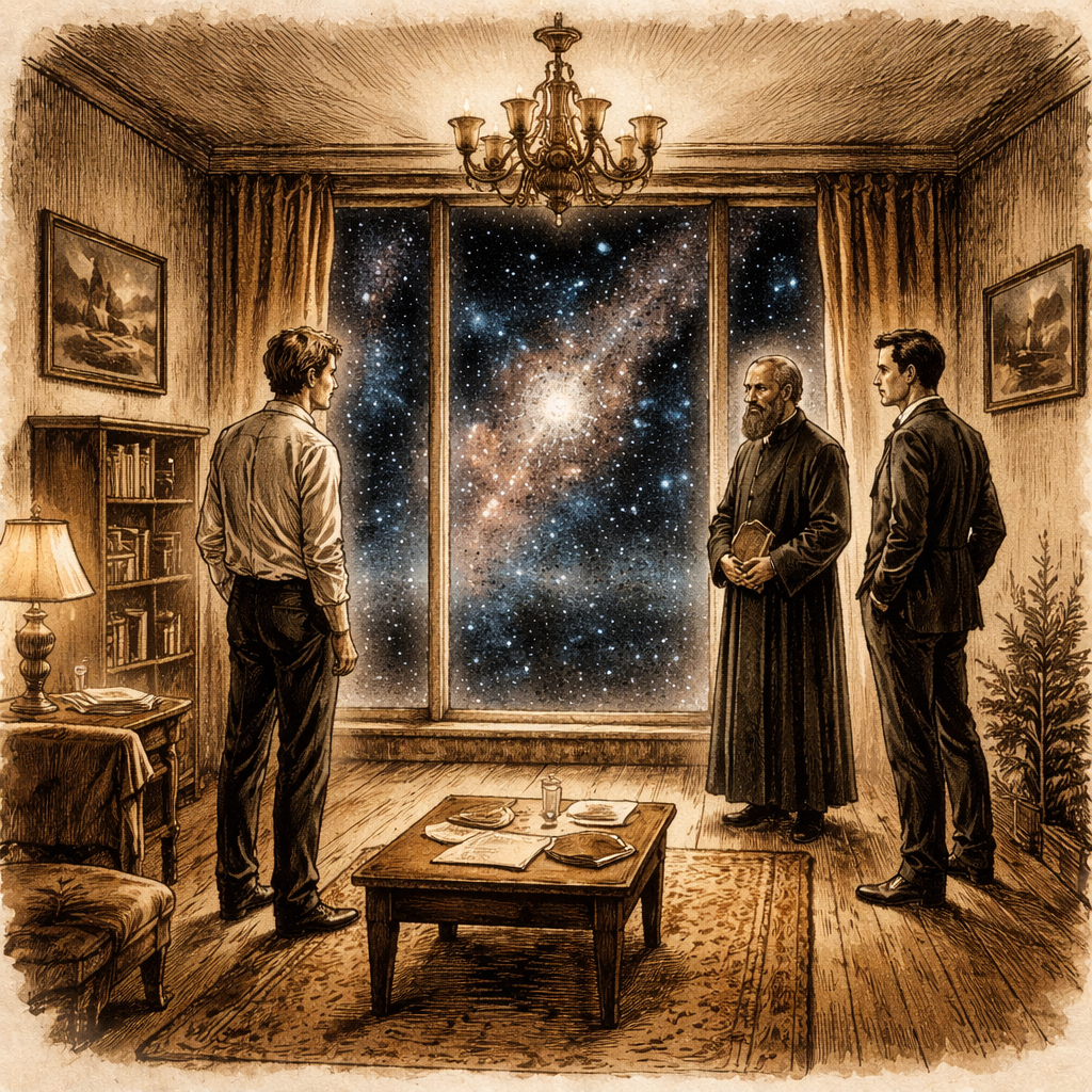 Он оказался... В комнате. Обычной комнате, с мебелью и ковром, люстрой и картинами на стенах. Там был даже телевизор. В окнах мерцали бесчисленные звезды – прежняя пустота сменилась на космические пейзажи. А посреди комнаты стояли два человека и о чем-то спорили. Прочистив горло, Андрей обратился к ним: