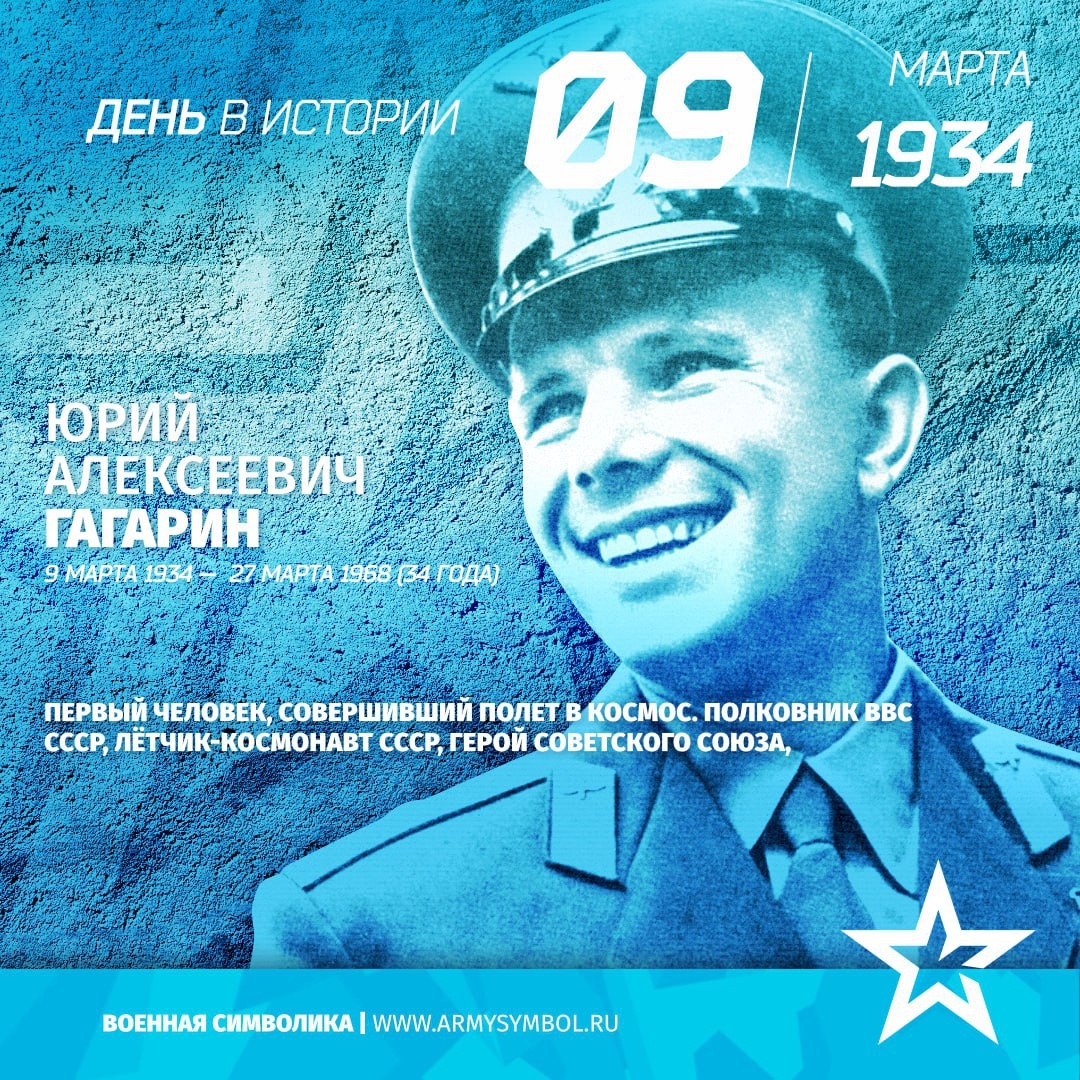 Юрий Алексеевич Гагарин (9 марта 1934, Клушино, Гжатский (ныне Гагаринский) район, Западная область, СССР — 27 марта 1968, возле села Новосёлово, Киржачский район, Владимирская область, СССР) — лётчик-космонавт СССР, Герой Советского Союза, кавалер высших знаков отличия ряда государств, почётный гражданин многих российских и зарубежных городов. Полковник ВВС СССР (1963), военный лётчик 1-го класса, заслуженный мастер спорта СССР (1961), член ЦК ВЛКСМ, депутат Верховного Совета СССР 7-го и 8-го созывов. 12 апреля 1961 года Юрий Гагарин стал первым человеком в мировой истории, совершившим полёт в космическое пространство. Ракета-носитель «Восток» с кораблём «Восток-1», на борту которого находился Гагарин, была запущена с космодрома Байконур. После 108 минут полёта Гагарин успешно приземлился в Саратовской области, неподалёку от Энгельса. Начиная с 12 апреля 1962 года, день полёта Гагарина в космос был объявлен праздником — Днём космонавтики.