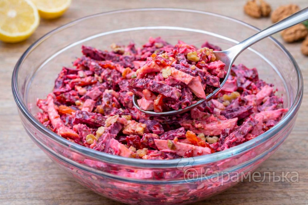 Здравствуйте, мои дорогие! Иногда так хочется приготовить что-нибудь вкусное, яркое и при этом совсем несложное. Бывает, открываешь холодильник, а там вроде бы самые обычные продукты — свекла, кусочек курочки, горсть орехов. И вдруг из этих простых ингредиентов получается такой салат, что домашние буквально исчезают с тарелкой за считанные минуты. У меня именно так и произошло, когда я впервые приготовила этот салат. Он получается очень красивый, насыщенного рубинового цвета, с приятной сладостью кураги, легкой пикантностью чеснока и ароматом копченой курицы. А грецкие орехи добавляют ту самую уютную домашнюю нотку, без которой многие салаты кажутся пустыми. Особенно приятно, что готовится он действительно быстро. Если свекла уже сварена заранее, то на всю подготовку уходит буквально несколько минут. Такой салат прекрасно подходит и для обычного семейного ужина, и для праздничного стола. Он выглядит ярко, аппетитно и всегда вызывает интерес у гостей. Часто после праздника меня спрашива