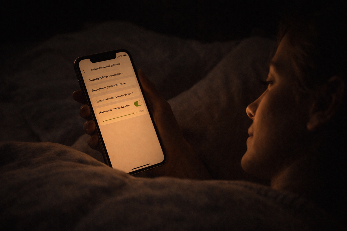 В iPhone есть настройка «Понижение точки белого». Она уменьшает интенсивность ярких цветов и белых оттенков, делая изображение мягче для восприятия в темноте.