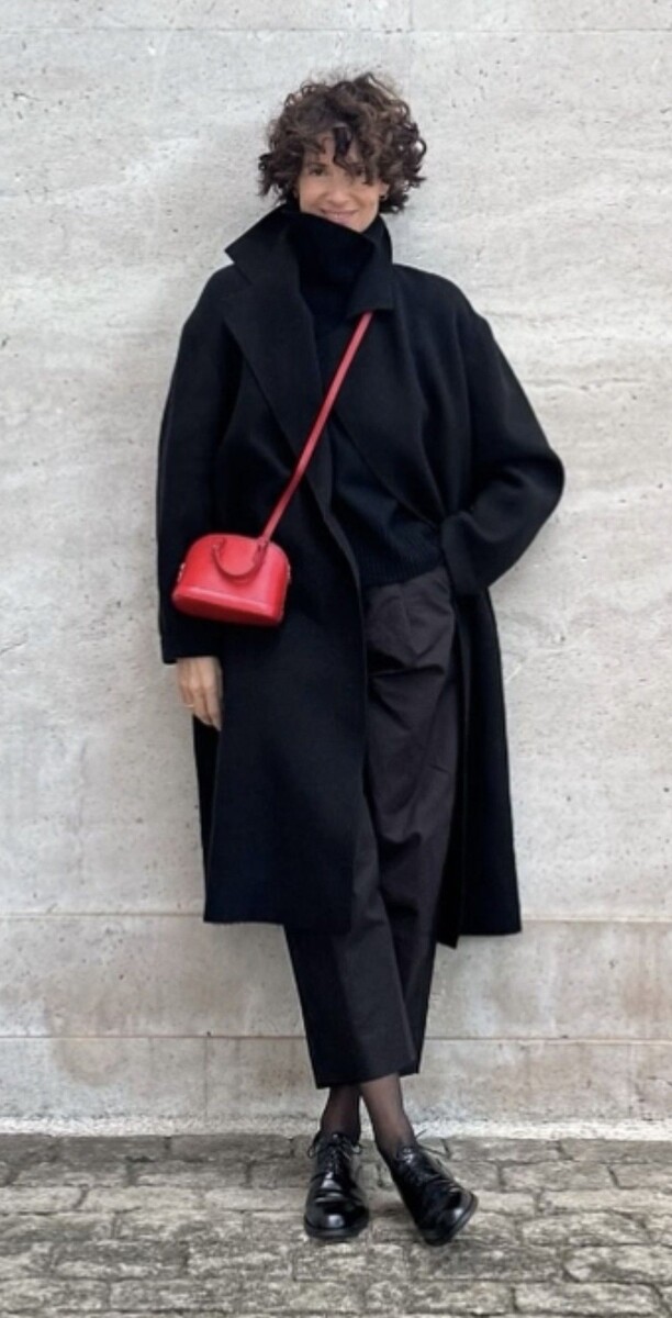 - Черный цвет позволяет создавать сдержанные и элегантные образы. К примеру, можно использовать вместе черные вещи: прямые брюки (укороченные), водолазку с высоким воротником и свободное пальто длиной ниже колен. Капроновые колготки и туфли тоже могут быть черными. А ярким цветовым «пятном» пусть будет аккуратная красная сумочка через плечо.