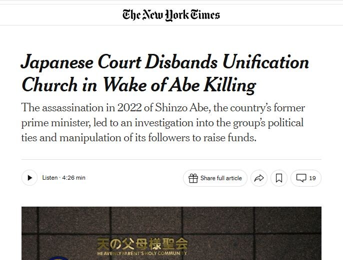 Статья «Японский суд распустил Церковь Объединения после убийства Абэ» (The New York Times, 25 марта 2025), авторы Мартин Факлер и Хисако Уэно, посвящена решению Токийского суда о роспуске японского отделения религиозной организации в контексте убийства бывшего премьер-министра Синдзо Абэ.