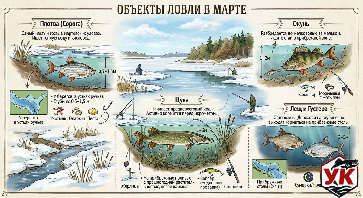 Март — переходный месяц: лед становится рыхлым и опасным, начинается паводок. Рыба ищет комфорт и кислород, готовясь к нересту.