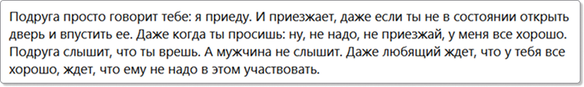 У автора хорошая подруга (кстати, чет не увидела в крике души даже намека на то, как она сама понимала, что подруге надо, и летела к ней в любое время дня и ночи, ну да ладно, сейчас не об этом). А вот мужчины рядом были только такие - предпочитающие не слышать и дождаться времени благополучия, чулочков, духов и туманов. Отсюда делается вывод, что абсолютно все женщины - спасающие ангелы, а мужчины - такое себе недоразумение на поразвлекаться, когда есть на то ресурсы жизни.
