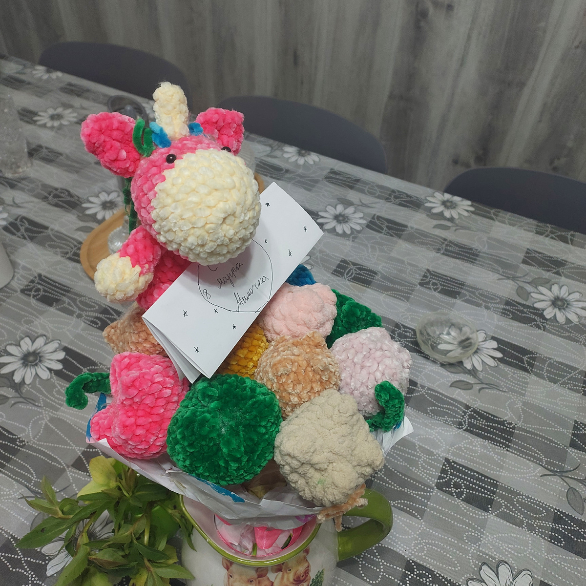 В этом году и я получила свой букет. Букет вязаных крючком тюльпанчиков от младшей приёмной дочери. И венчает это чудо рукодельного искусства вязаная милая игрушка единожки, который держит открытку с поздравлениями и добрыми пожеланиями.