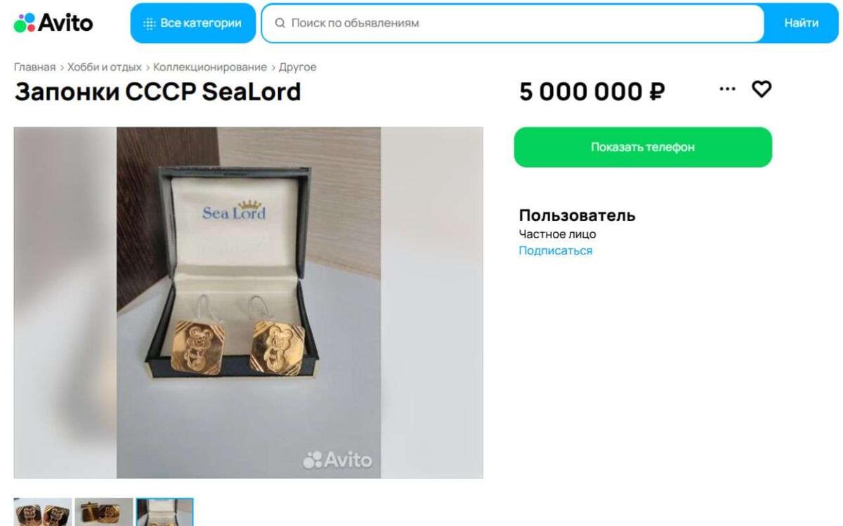 В Воронежской области выставили на продажу запонки с символикой летних Олимпийских игр 1980 года, которые проходили в Москве. Согласно информации, опубликованной на сайте объявлений «Авито» в пятницу, 6 марта, за раритетный аксессуар просят 5 млн рублей. – Артефакт эпохи Советского Союза. Запонки, которые изготовлены известной фирмой Sea Lord в честь великого события, могут занять достойное место в любой коллекции, – подчеркивает собственник. Отметим, что речь идет об английской компании, продукция которой во времена СССР была в дефиците, высоко ценилась и являлась признаком принадлежности к элите. На выставленном на продажу экземпляре изображен талисман московских Игр – олимпийский Мишка. Продавец эксклюзивных запонок проживает в селе Боево Каширского района.