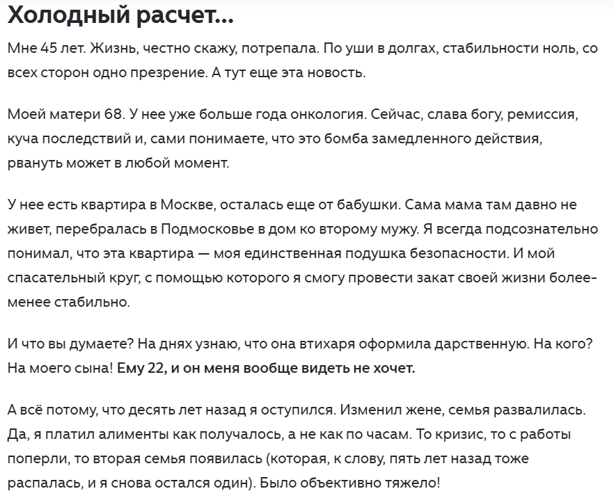 Временами люблю почитать истории из зоопарка от юристов, к которым приходят сказочные персонажи, олицетворяющие (как минимум - для меня) самое дно. Иногда мне кажется, что эти образы вымышлены - кажется, что уж настолько-то опуститься нельзя... Но, впрочем, иногда и в жизни попадаются настолько отбитые деятели, что в существование тех, про кого пишут юристы, легко можно поверить. Вот - из относительно свежего. Там буквально в нескольких абзацах исповедь абсолютного дна. Да что там "в нескольких" - в одном, самом последнем, за 4 строчки с ним всё понятно. Итак, этот персонаж изменил жене (сам он это называет "оступился"), но семья в его представлении "развалилась" (сама собой, без особой связи с предыдущим событием), после этого не платил алименты ("кризис" и "с работы попёрли" - это как будто бы смягчающее обстоятельство, освобождающее от обязанностей по содержанию собственного сына). Наделал долгов. Дальше шедевр - "вторая семья появилась" (сама собой, вообще без участия сабжа), а пот