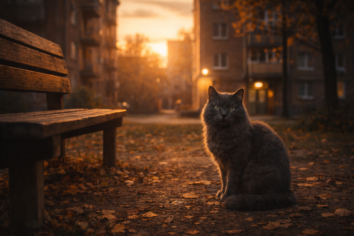 Серый кот появился во дворе в начале ноября. Никто точно не заметил, когда именно. Просто в какой-то момент жильцы дома начали видеть его у подъезда. Он был обычным на первый взгляд: серый, пушистый, с немного потрёпанными ушами и спокойными зелёными глазами. Таких котов во дворах десятки. Но этот отличался одной странной привычкой. Он никогда не подходил к людям. Никогда не просил еды. И никогда не сидел у мисок, которые иногда выставляли бабушки из соседнего подъезда. Он просто… ждал. Иногда у лавочки. Иногда возле клумбы. Иногда у мусорных баков. Но всегда — молча. Первой на него обратила внимание Лена из третьего подъезда. Точнее, он сам обратил на неё внимание. Это случилось в тот вечер, когда она возвращалась с работы и впервые за десять лет несла домой не пакеты с продуктами, а папку с документами о разводе. Осенний ветер гонял листья по асфальту, двор казался пустым и чужим. Лена подошла к подъезду, достала ключи — и вдруг услышала тихое «мяу». Она оглянулась. Серый кот сидел