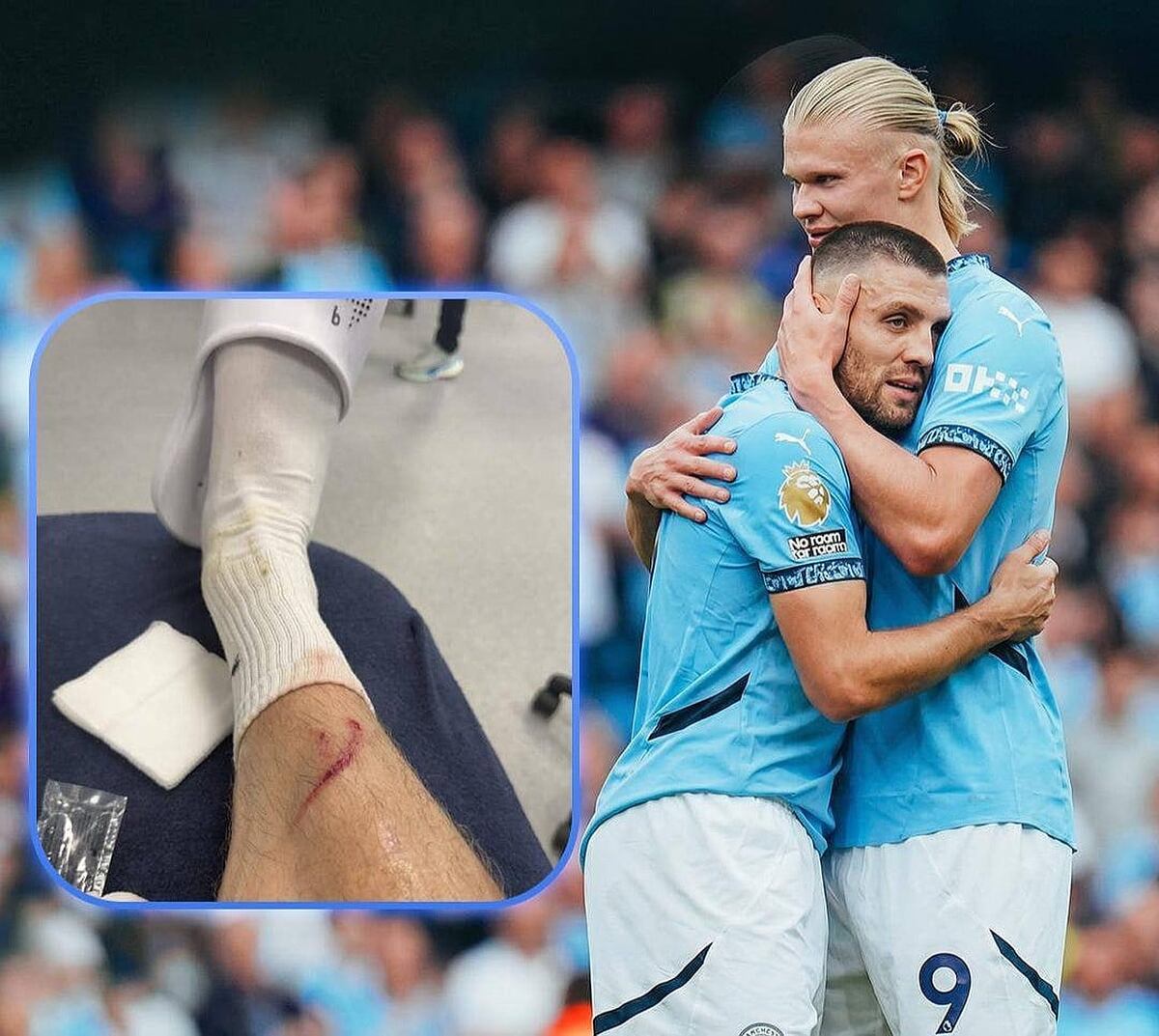 На снимке четко видны глубокий след и порез на голени, оставленные бутсой. Норвежский футболист с юмором прокомментировал ситуацию, обвинив в травме своего одноклубника Матео Ковачича и поблагодарив его.