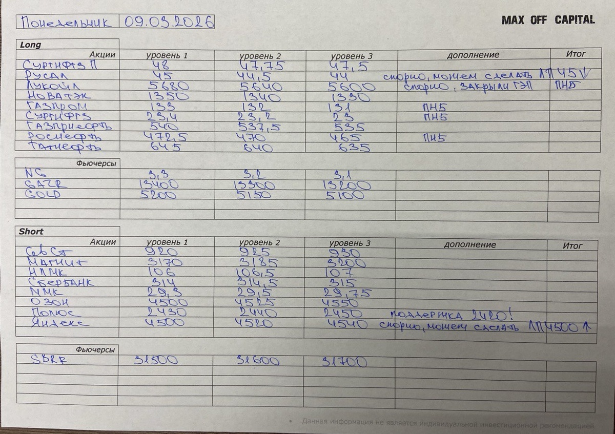 ✅ РЕКОМЕНДАЦИИ НА СЕГОДНЯ ➡️ Личный совет 👍 Сегодняшний день в PRO ▫️ Наши РЕСУРСЫ 😉 Стратегия ЗАДЁРГА 😉 Как пользоваться рекомендациями 😉 Как пользоваться ATR 😉 Видео моих сделок 😉 Куда ставить СТОП 😉 Дневник трейдера 😉 Как определить точку входа Уровни (часть 1) Уровни (часть 2) ТОЧКА ВХОДА Часть1 ТВХ Пробой ТВХ ЛП1Б (ложный пробой 1 баром) ТВХ ЛП2Б (ложный пробой 2 барами) ТВХ СЛП (сложный ложный пробой) ТВХ Отбой 1 баром ТВХ Отбой 2 барами ТВХ Дополнение Как рассчитать ATR Таблица рсчёта ATR Вероятности на рынке (часть1) Вероятности на рынке (часть2) Худшие дни для торговли на Бирже Зачем нужен индекс ММВБ Хватит делать эту ошибку Как работает крупный участник Что такое сильнее рынка Кто за кем ходит Как выбрать направление Где смотреть ИНДЕКСЫ и ТОВАРЫ ❗️Помним, сегодня Понедельник и пятничные закрытия могут быть всего лишь фиксацией прибыли ! 💬 Бесплатный | Чат - ПЕРЕЙТИ #рекомендации
