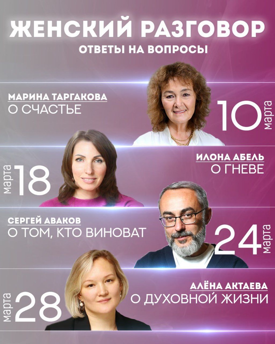 🌹🌹🌹🌹🌹🌹🌹🌹🌹🌹 на Женский Разговор! Мы живем в мире, где так легко потерять себя за повседневной суетой, чужими ожиданиями и бесконечным поиском внешнего успеха. Но что, если счастье - это не цель, а привычка? Что, если судьба - не приговор, а урок? Приглашаем вас на цикл из ❤️ встреч, где мы вместе исследуем глубины человеческой души, работу с эмоциями и духовный путь в современном мире. Темы разговора: 1️⃣. "О счастье" Спикер: Марина Замшарифовна Таргакова Счастье часто кажется нам недостижимой вершиной. Но что, если научиться быть счастливым здесь и сейчас, независимо от обстоятельств? Разговор о внутреннем состоянии как основе гармоничной жизни. 2️⃣. "О гневе" Спикер: Илона Абель Гнев разрушает отношения и внутреннюю гармонию. Как не позволить эмоциям управлять нами? Практические инструменты работы с гневом в семье и на пути духовного развития. 3️⃣. "О том, кто виноват" Спикер: Сергей Витальевич Аваков Закон кармы и свобода воли. Где заканчивается жертвенность и