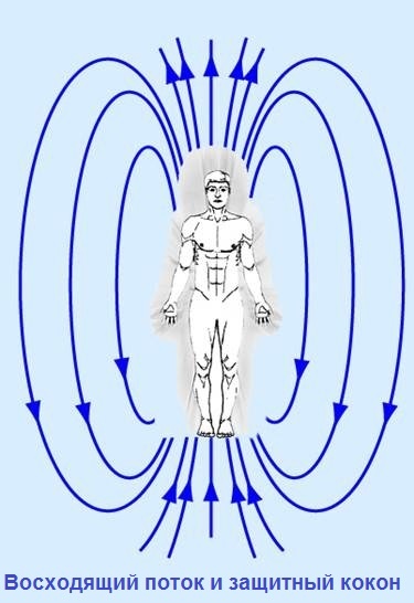 Можно сказать, что нисходящий поток, входящий в макушку головы и выходящий из ступней ног, по отношению к восходящему потоку движется зеркальным образом. Эти два энергетических потока движутся встречно, не мешая один другому, а наоборот, усиливая друг друга, представляя собой энергетическую защиту человека – защитный кокон.