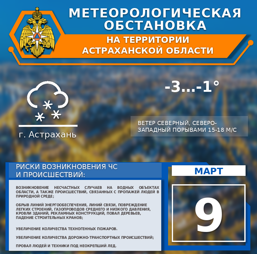 На территории области переменная облачность. Местами небольшие осадки, преимущественно в виде снега, налипание мокрого снега на проводах и деревьях. В отдельных районах гололедно-изморозевые явления, гололедица. Ветер северный, северо-западный 8-13 м/с, местами порывы 15-20 м/с. Температура воздуха -8...-3°, по югу -3...+2°. По г. Астрахань переменная облачность. Небольшие осадки в виде снега. Ветер северный, северо-западный порывами 15-18 м/с. Температура воздуха -3...-1°.