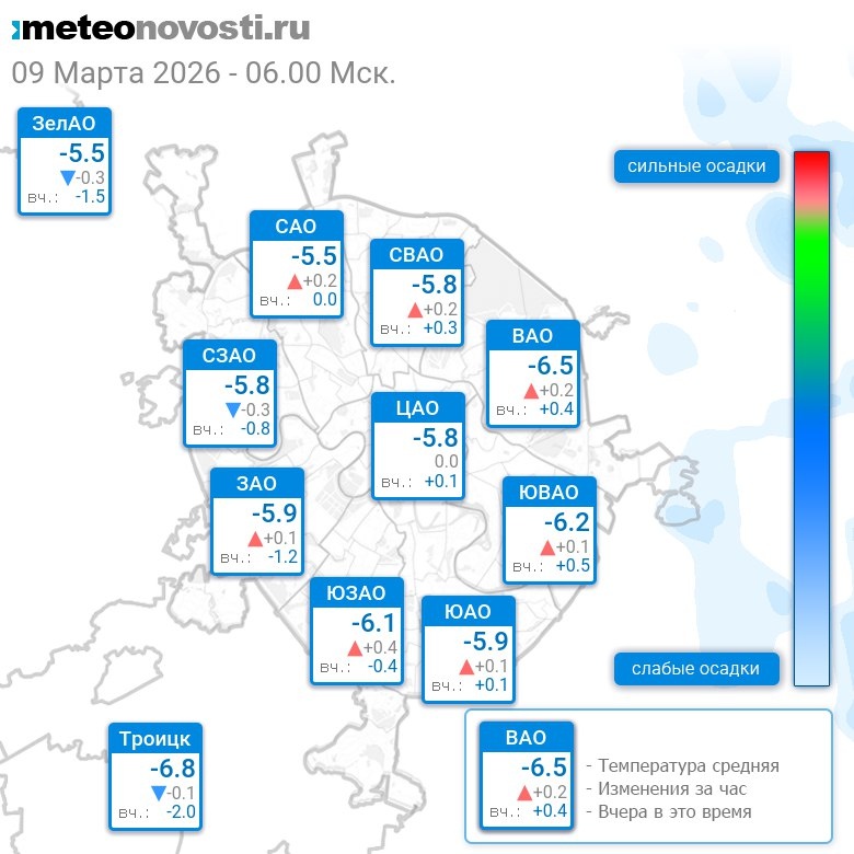 В 6:00 в Москве было от -7.2°C до -5.1°C, средняя температура -5.9°C #погода #Москва #весна #температура #9марта #понедельник