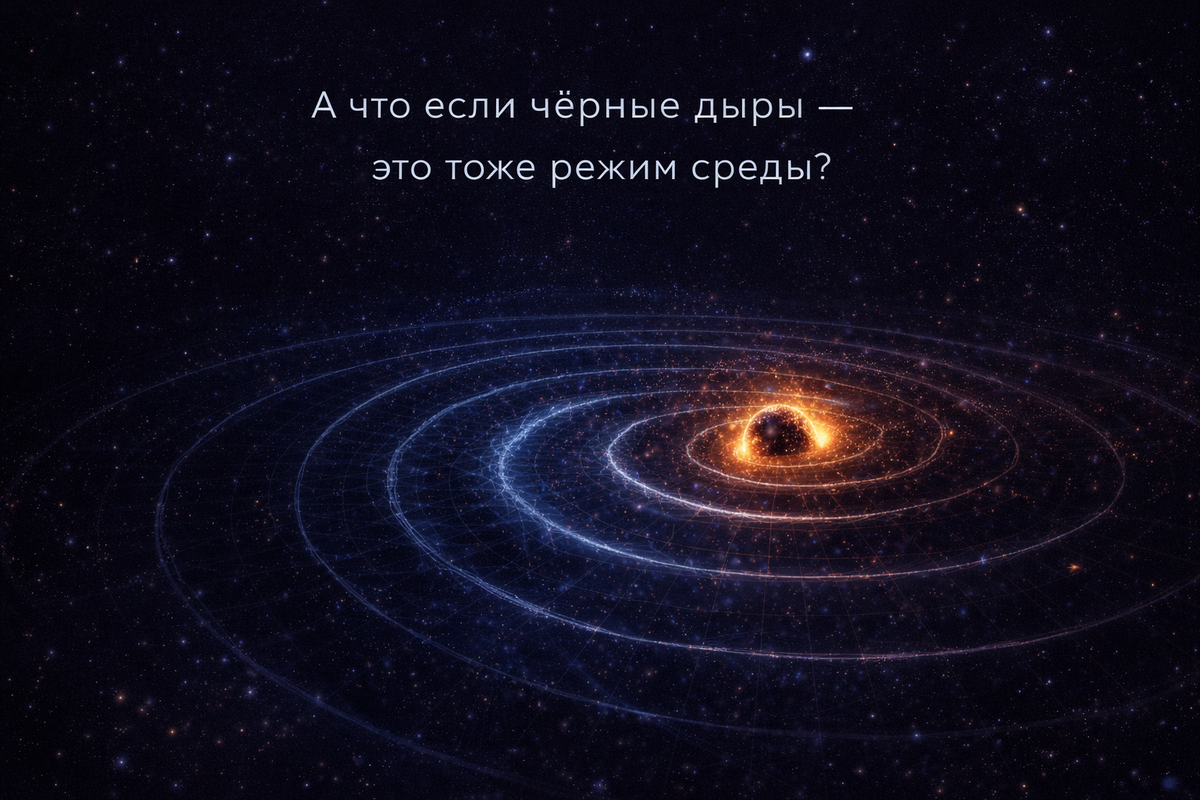 Для возбуждений возникает граница – своего рода горизонт. Такие эксперименты давно существуют и хорошо изучены. После этого возникает естественный вопрос. Если лабораторные горизонты появляются как режим среды, то что мы на самом деле наблюдаем в космосе? В средовой картине пространство ведёт себя как связная динамическая система. Это означает, что при достаточно сильных возмущениях могут возникать устойчивые структуры. Но как и в любой среде, у таких структур есть режимы: Именно последняя стадия особенно интересна. Когда два компактных объекта сливаются, результат не сразу становится устойчивым. Система некоторое время “звенит”, постепенно теряя энергию. Этот этап называют ring-down – затухающим звоном. Гравитационно-волновые детекторы уже наблюдали такие сигналы. Они выглядят как короткая последовательность затухаю