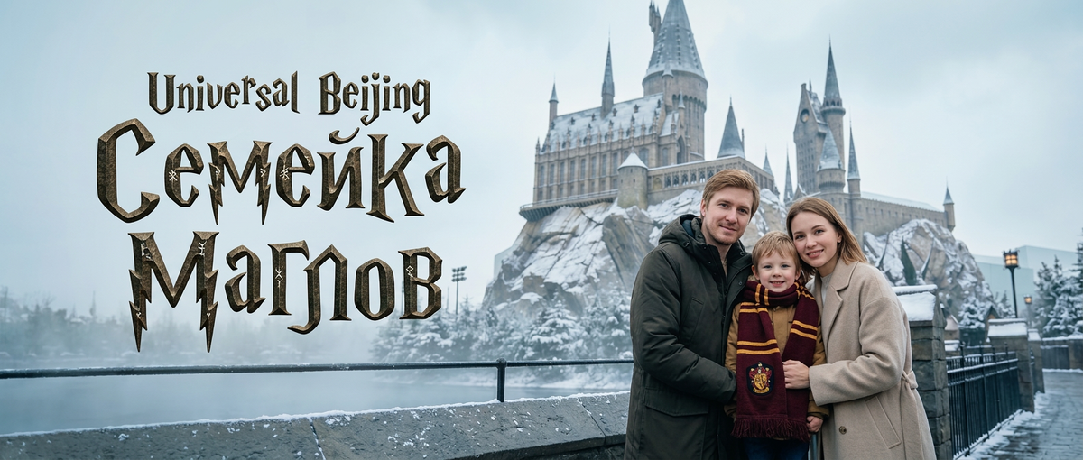 Мы сначала отправились во Вселенную Гарри Поттера. Здесь мы взяли два вида пива: сливочное — 50 юаней, и Hoegaarden — 68 юаней (оплачивал РСХБ картой. Атмосфера потрясающая: каменные стены, витрины, музыка — всё как в фильмах. Но на улице было так прохладно, что долго задерживаться не получилось, начали реально подмерзать. Отправил жену посмотреть замок, так как с ребенком не пускают.