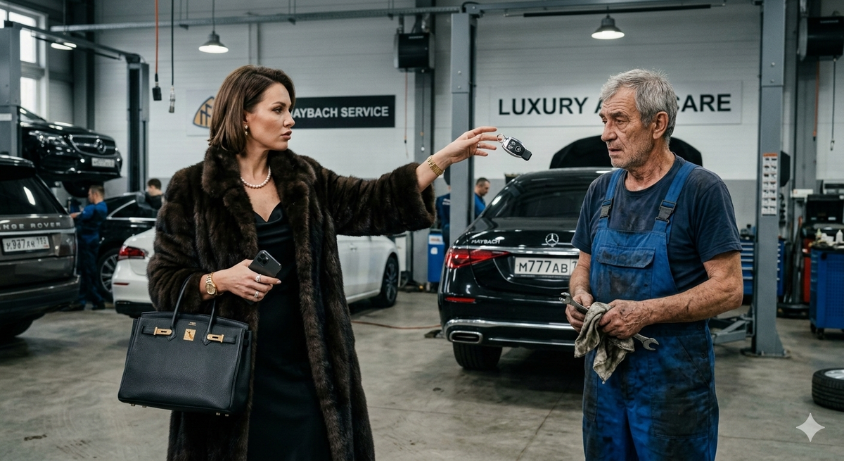 Она достала из сумочки тяжелый ключ от Майбаха и небрежно швырнула его прямо в механика. Ключ ударился о его комбинезон и со звоном упал на чистый пол.