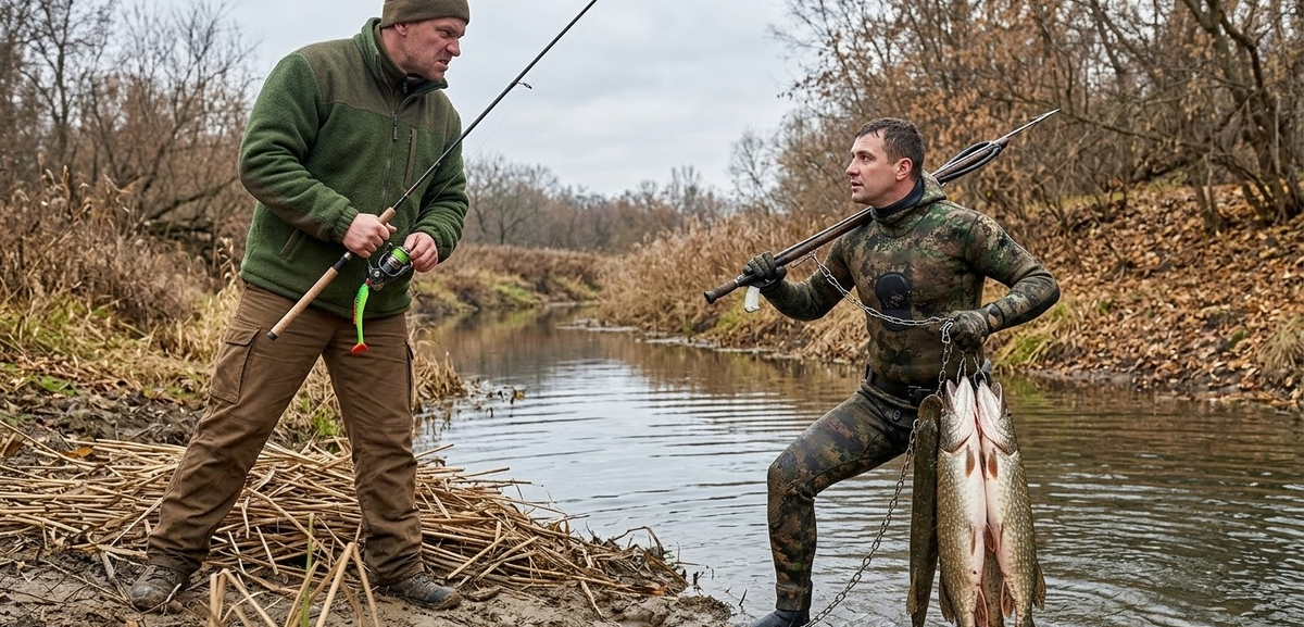 Споры между рыбаками с удочкой и любителями подводной охоты не утихнут, наверное, никогда. Приветствую вас, уважаемые рыбаки, вы на канале "Клевая рыбалка". Долгое время я, как и многие, считал главным злом на водоемах классических браконьеров с дешевыми китайскими сетями. Сеть можно зацепить джигом, порезать ножом, вытащить на берег и сжечь. Но пару лет назад мои взгляды кардинально изменились после одного осеннего выезда. Теперь я уверен: человек в гидрокостюме с ружьем на малой реке — это настоящая саранча, после которой водоем умирает на годы. Дело было в конце октября на моей любимой микроречке. Вода в это время сильно падает, трава ложится на дно, и наступает тот самый идеальный "прозрак" — видимость достигает трех-четырех метров. Белая рыба скатывается в глубокие закоряженные ямы на зимовку, а вслед за ней уходит и крупный хищник. Вода ледяная, рыба стоит плотными стаями в анабиозе и практически не реагирует на приманки. Я стоял на обрывистом берегу и методично простукивал вход