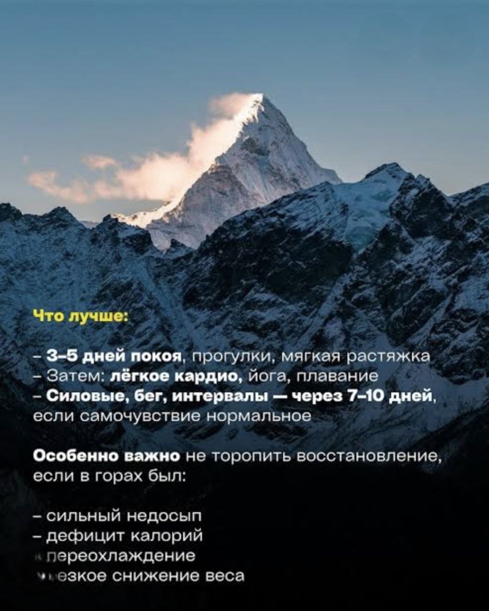 😉👍👍 Как восстановиться после похода в горы После восстановления (завершения) похода необходимо: 🔹️ полноценно отдохнуть (сон, теплая ванна) 🔹️ восполнить водный и электролитный баланс, полноценно поесть для восстановления мышц 🔹️ проверить здоровье (ноги, общее состояние) 🔹️привести в порядок снаряжение (просушить, очистить). Основные этапы восстановления: Физическое восстановление: Отдых и сон: Увеличьте время сна, позвольте организму восстановиться. Вода и электролиты: Обильное питье помогает снять мышечные спазмы. Питание: Потребляйте достаточно белка для восстановления мышц. Расслабление: Горячая ванна, легкий самомассаж или МФР (миофасциальный релиз). Уход за телом: Проверьте ноги на мозоли, используйте кремы при необходимости. Работа со снаряжением: Сушка: Тщательно просушите палатку, спальник и одежду, чтобы избежать плесени. Очистка: Очистите обувь и рюкзак от грязи. Проверка: Осмотрите снаряжение на наличие поломок Что делать, если были сложные усло