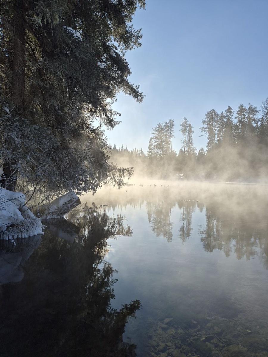 Сегодня утром мы встретили рассвет на Тёплом озере. Температура воздуха составляла -25 градусов, а озеро парило, создавая впечатление, будто оно кипит.