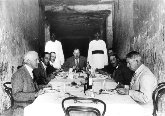1923 год Египет, 1923 год. Археологи устраиваются на обед прямо внутри гробницы Рамсеса XI в Долине царей. На фотографии — не постановочный кадр, а обычная рабочая пауза: люди едят, разговаривают, отдыхают от зноя снаружи. Этот снимок сделан в один из самых насыщенных периодов египтологии. Годом ранее, в 1922 году, Говард Картер вскрыл гробницу Тутанхамона — и весь мир замер. Египет превратился в эпицентр научного и публичного интереса. Экспедиции работали в интенсивном режиме, конкурируя за открытия и финансирование. Гробница Рамсеса XI, одного из последних фараонов XX династии, была известна давно: её обнаружили ещё в XIX веке. Но работа по её изучению продолжалась. Внутри было прохладнее, чем снаружи под безжалостным египетским солнцем, а потому гробница вполне естественно становилась и рабочим пространством, и местом отдыха. Никакого пиетета, никакой торжественности. Просто люди за едой — в окружении росписей, которым три тысячи лет. Археология — это не только открытия. Это ещ