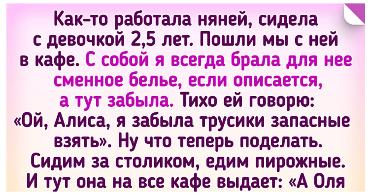 - Как-то работала няней, сидела с девочкой 2,5 лет. Пошли мы с ней в кафе. С собой я всегда брала для нее сменное белье, если описается, а тут забыла. Тихо ей говорю: «Ой, Алиса, я забыла трусики запасные взять». Ну что теперь поделать. Сидим за столиком, едим пирожные. И тут она на все кафе выдает: «А Оля трусики забыла!» Кафе просто ржало. © Ольга Гензе