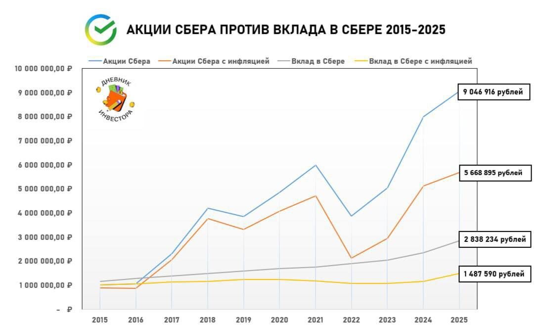 Вложенный 1 млн ₽ в 2015 году превратился в 9 млн ₽ с учётом выплаченных дивидендов. 🏦 Вклад в Сбере: