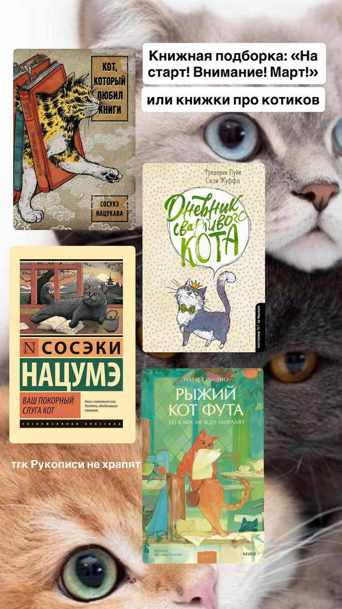 Подборка "На старт! Внимание! Март!" 🐱 или книжки про котиков 1. Сосуке Нацукава. Кот, который любил книги 2. Сосэки Нацумэ. Ваш покорный слуга кот 3. Фредерик Пуйе, Сюзи Жуффа. Дневник сварливого кота 4. Наги Симэно. Рыжий кот Фута из кафе между мирами Раньше всего отзывы и обзоры на книги выходят у нас в телегам. Подписывайтесь https://t.me/pro_novel