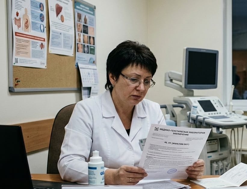 В кабинет заходит молодая женщина 27 лет. Это её третья беременность, дома уже двое детей. На первый взгляд — стандартная диспансерная книжка, полупустая, как это часто бывает на ранних сроках. Но среди справок я нахожу документ, который заставляет меня вздрогнуть: заключение медико-генетической лаборатории города N.