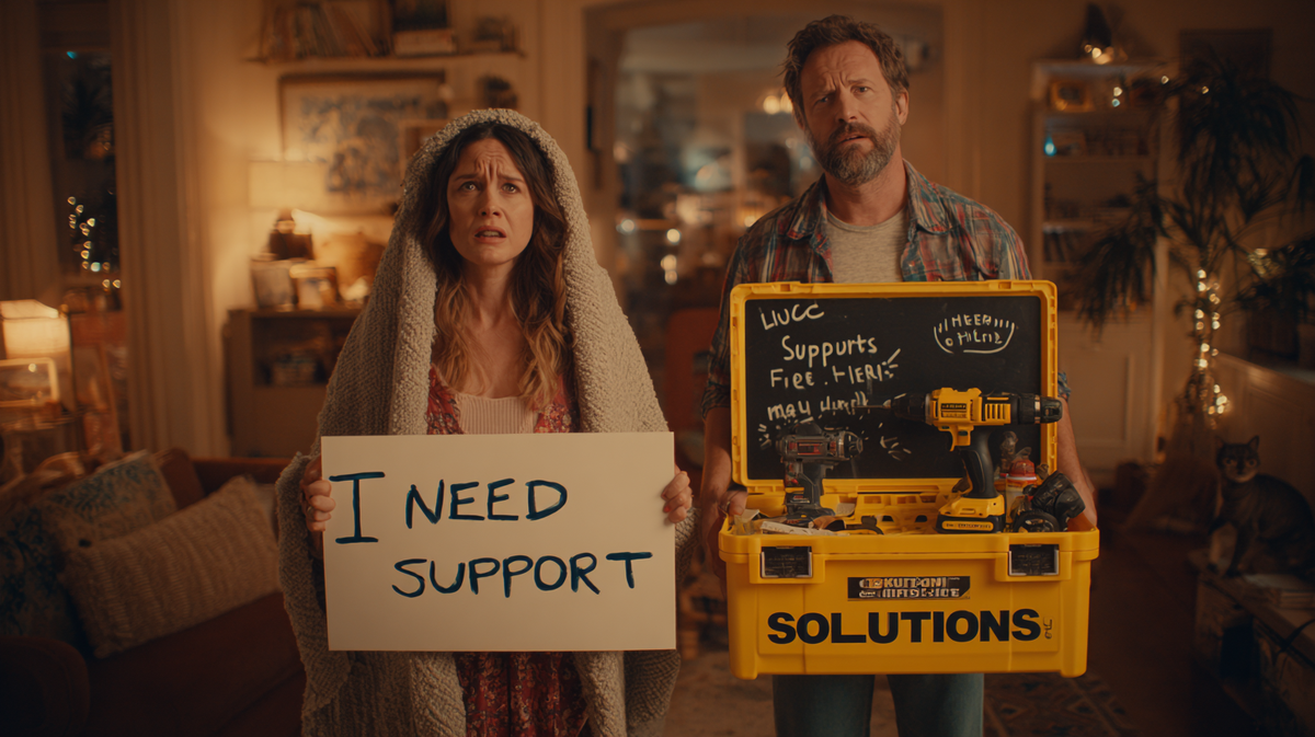 Это когда он вместо “поговорим” делает “решение”. Вместо “обниму” — “вот тебе список шагов”. Вместо “бедная моя” — “давай я отвезу/куплю/сделаю”. И ты думаешь: “он сухой”. А он думает: “я же помогаю!” Многие мужчины (и некоторые женщины) воспитаны так: поддержка =