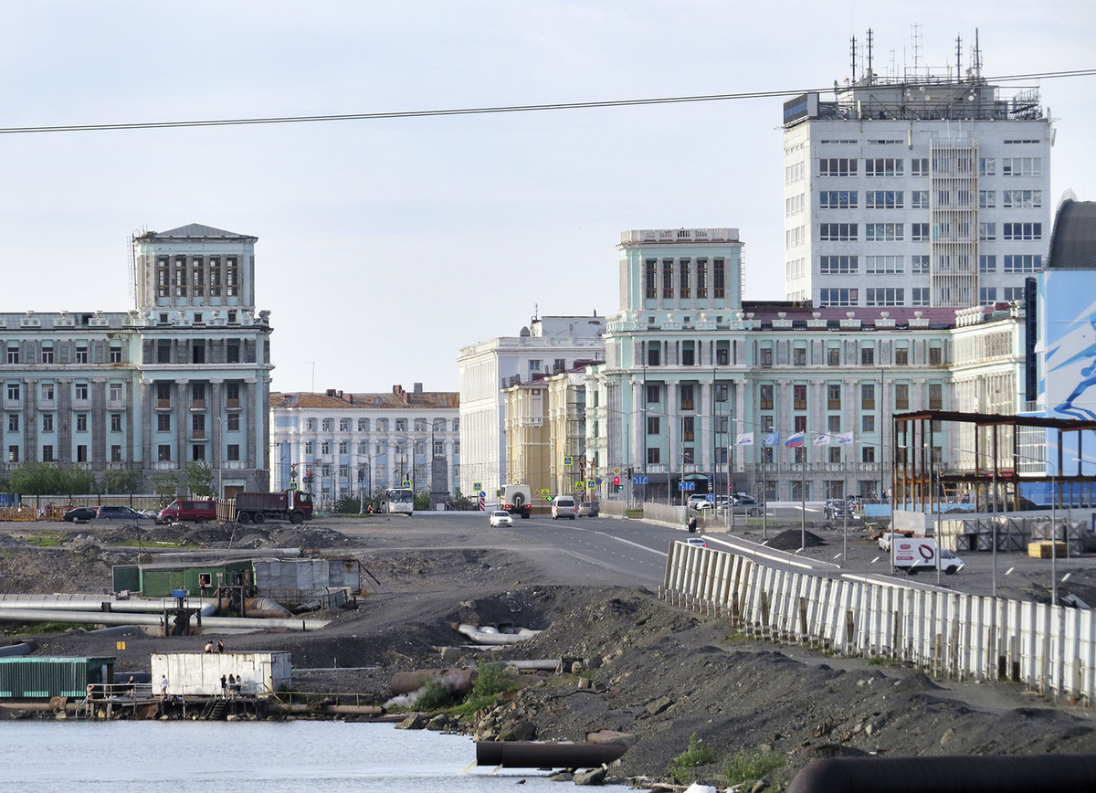 У грандиозных сталинок Гвардейской площади на скальном "острове" в вечной мерзлоте, где теперь обитает управление Норильского горно-металлургического комбината, проспект заметно поворачивает: