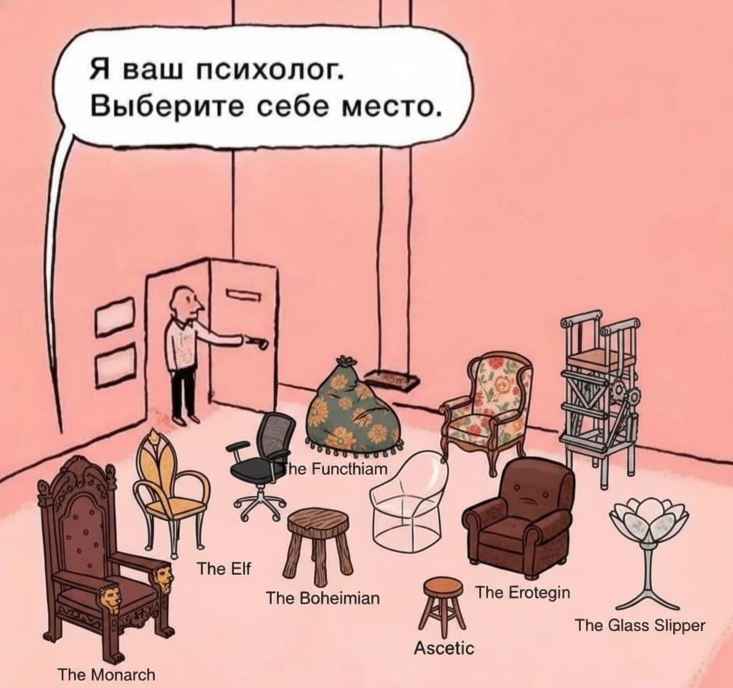 Предлагаю немного поисследовать ваше подсознание через метафоры. Перед вами 12 стульев — 12 разных состояний, характеров и стратегий жизни.