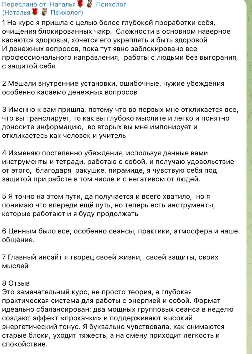 " 🕊 Мои хорошие, хочу поделиться с вами одной из тех историй, ради которых я и создала курс «Пробуждение». Когда Наталья пришла на курс, она знала, что хочет проработать блоки, но жизнь чувствовалась как постоянная борьба: выгорание от работы с людьми, неуверенность в завтрашнем дне и ощущение, что энергия просто утекает сквозь пальцы. Она пришла с простыми и такими важными для каждой из нас целями: 💥укрепить здоровье и навести порядок в денежной сфере, перестать чувствовать себя «губкой», впитывающей чужой негатив. ⚡️Что мешало? Внутренние установки, чужие убеждения о деньгах, которые сидели глубоко и не давали двигаться вперёд. А теперь — посмотрите, что изменилось всего за несколько недель нашей совместной работы. Во-первых, появилась защита. Наталья научилась выстраивать ее. Теперь, работая с людьми, она не выгорает, а остаётся в своём ресурсе. Это не магия — это навык, которому можно научиться. Во-вторых, вернулась энергия. Через сеансы и практики ушли те самые блоки, кот