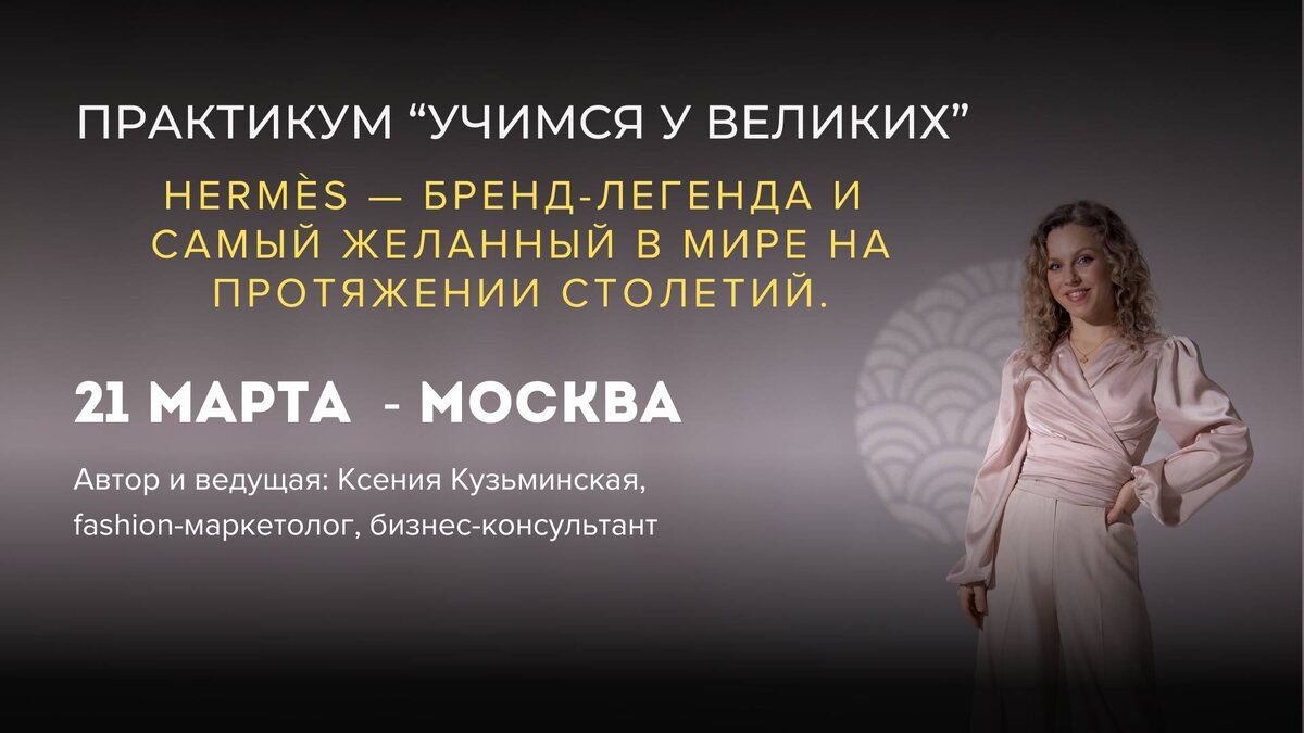 практикум «Учимся у великих» — Hermès — бренд-легенда и самый желанный в мире на протяжении столетий. ❝Маркетинг, который выстроит очередь из клиентов.❞ РАЗБЕРЕМ МАРКЕТИНГОВЫЕ ФИШКИ, СТРАТЕГИЮ И ИСТОРИЮ БРЕНДА HERMÈS На этом практикуме: • погрузитесь в историю бренда; • узнаете, какие стратегические решения позволяют бренду существовать столько лет и занимать лидирующие позиции; • поймёте, как ДНК-бренда должно работать на вашу компанию; • разберетесь, как использовать стратегию дефицита и усилить спрос; • увидите, как формируется ценность без агрессивной рекламы; • получите вдохновение, которое даст возможность взглянуть на свой бизнес шире 📍Что будет: — история бренда — разбор ключевых маркетинговых подходов, стратегий и инструментов для развития бизнеса — практические задания, чтобы вы смогли перенести опыт бренда на свой бизнес В результате практикума вы: • увидите, что у вас уже есть всё для развития • определите комплекс маркетинговых фишек, который повысит узнаваемость ваш