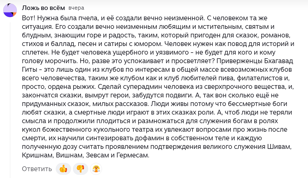Этот комментатор — классический пример того, как ложное эго (аханкара) защищается от истины. Он увидел архитектуру системы, но интерпретировал её через обиду и гордость.